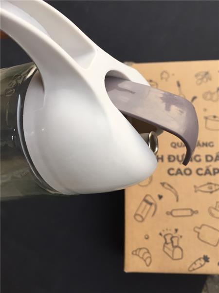 - Chất liệu: thân bình bằng thủy tinh, nắp đậy bằng nhựa PP và silicon, đầu rót bằng thép không gỉ.