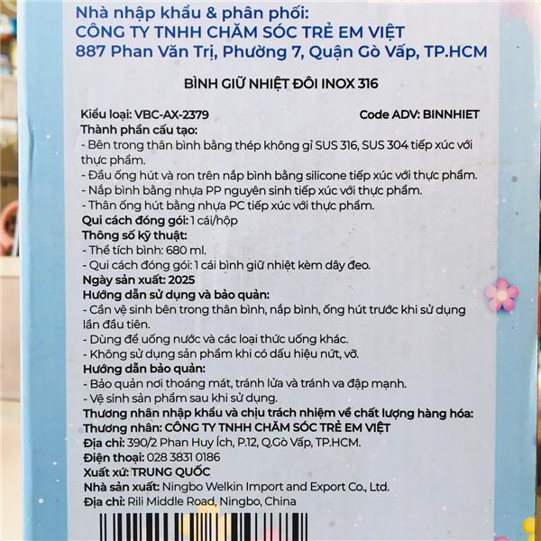 Sản phẩm là hàng quà tặng được nhập khẩu chính ngạch bởi một công ty chuyên về chăm sóc trẻ em (Công ty TNHH Chăm Sóc Trẻ Em Việt), có thông tin liên hệ và địa chỉ rõ ràng, giúp người dùng yên tâm về tiêu chuẩn chất lượng.