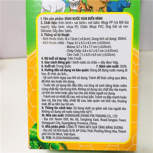 - Thành phần: thân bình + vai bình + nút bấm: nhựa PP (và bột lúa mạch); nắp bình: nhựa PC; chibi: nhựa PVC, ống hút và ron: silicone; dây đeo: satin