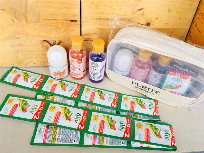 - Bộ gồm: 1 túi đựng, 2 chai sữa tắm 2 mùi khác nhau, 14 gói dầu gội loại sd 1 lần, 1 chai lăn khử mùi