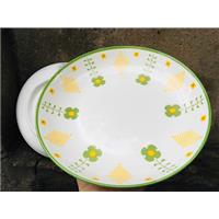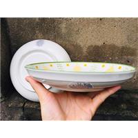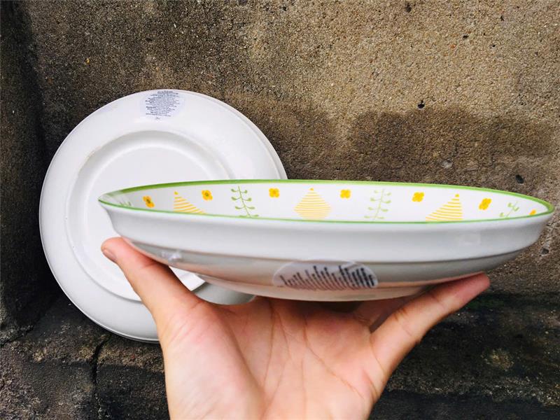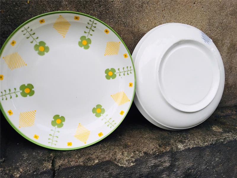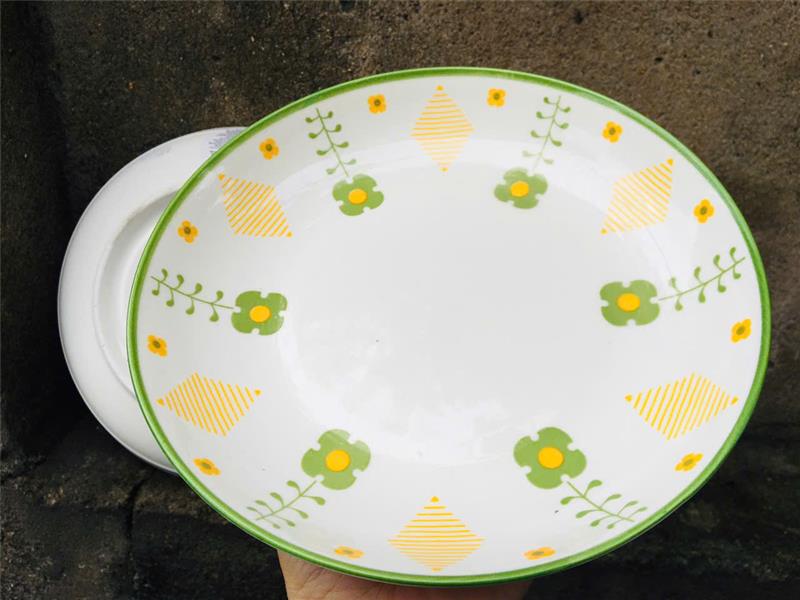 - Màu sắc/ kiểu dáng: dĩa tròn sâu lòng, miệng viền xanh, lòng dĩa có họa tiết phong cách retro, bên ngoài men trắng.