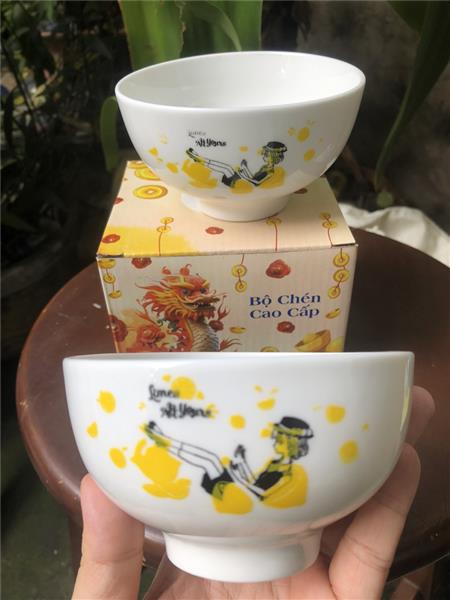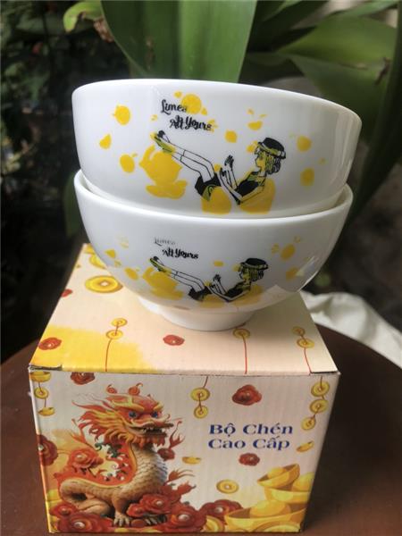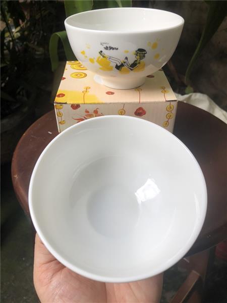 - Màu sắc/ hoạ tiết: chén trắng có hoạ tiết cô gái + chữ một mặt trên thân chén như hình chụp