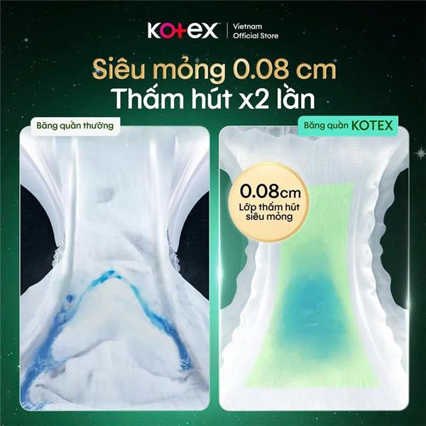 + Thấm hút vượt trội: Với công nghệ chống tràn độc quyền, băng quần Kotex có khả năng thấm hút lượng chất lỏng lớn, đảm bảo sự khô thoáng suốt nhiều giờ liền.