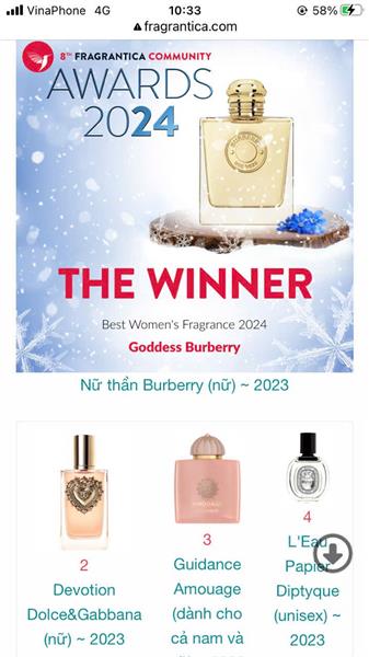 Nếu bạn đang tìm kiếm một chai nước hoa vừa mang đến sự ngọt ngào, quyến rũ nhưng vẫn thể hiện được cá tính mạnh mẽ thì Burberry Goddess EDP chính là lựa chọn hoàn hảo. Đứng đầu danh sách nước hoa nữ tốt nhất năm 2024, Burberry Goddess EDP chinh phục mọi tín đồ hương thơm nhờ sự kết hợp tinh tế của vanilla Madagascar – ngọt ngào, ấm áp nhưng không hề gắt. Vanilla là điểm nhấn chủ đạo, mang đến cảm giác mềm mại, quyến rũ, được làm tròn vị với các nốt hương gỗ ấm áp và xạ hương nhẹ nhàng.