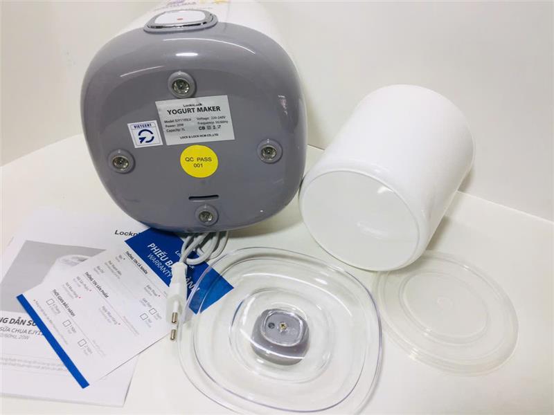 - Sản phẩm gồm: 1 thân máy, 1 nắp đậy thân máy, 1 hũ làm sữa chua, 1 nắp đậy hũ, 1 sách hướng dẫn, 1 phiếu bảo hành, 1 hộp đựng toàn bộ sản phẩm