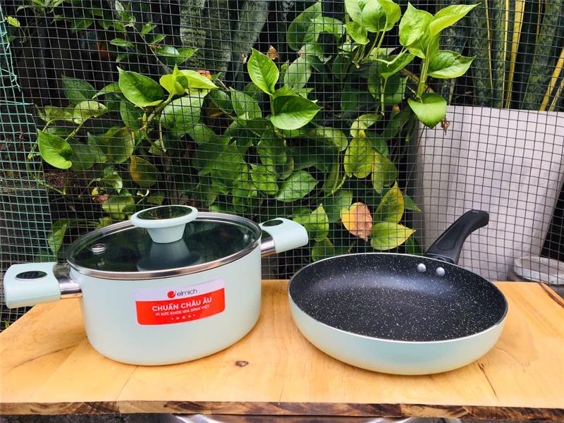 * Nồi cùng màu với nồi chảo Chống Dính Elmich EL-5973SK20 Size 20cm shop đang bán, shop để hình chụp chung chảo với nồi cho bạn dễ hình dung nhé.