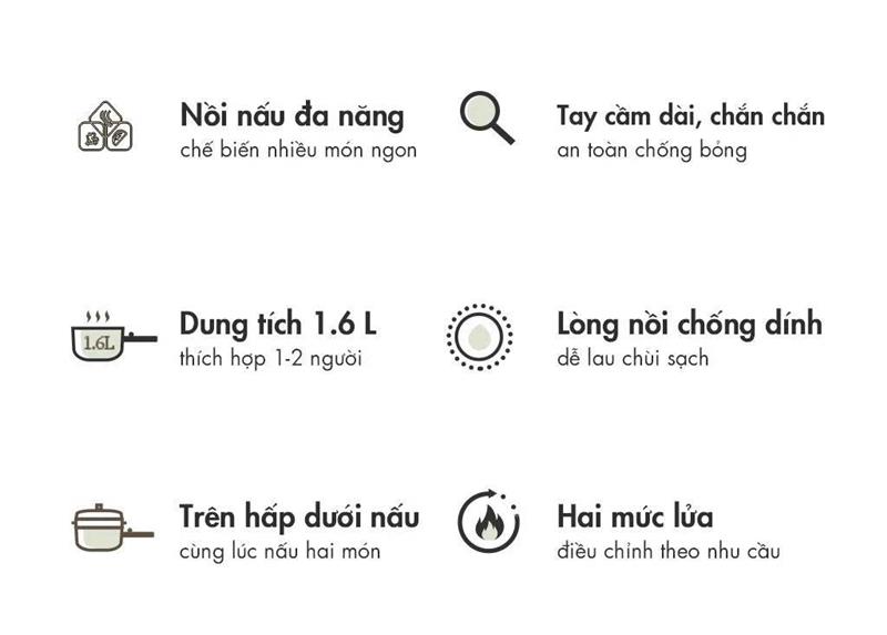 + Dung tích lớn 1,6 lít, đáp ứng khẩu phần cho 2 người
