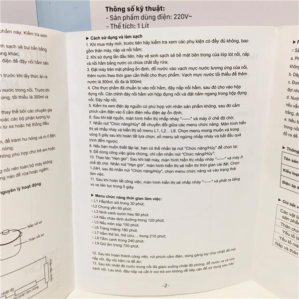 - Bộ sản phẩm gồm: 1 thân máy tích hợp bảng điều khiển đèn led, 1 thố sứ, 1 nắp thố sứ, 1 nắp nhựa, 1 giấy hướng dẫn sử dụng bằng tiếng Việt