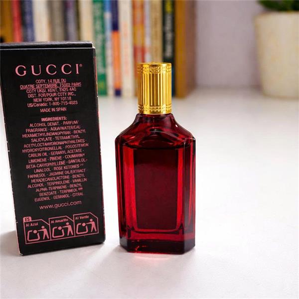 - Chai bằng thuỷ tinh, nắp ấn, đựng trong hộp giấy: Thiết kế mô phỏng hoàn hảo chai full-size với thân chai màu hồng đá quý và họa tiết hoa đặc trưng của Gucci.