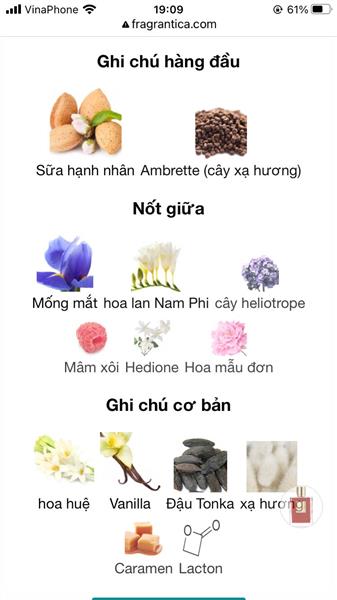 + Hương cuối: hoa huệ, vanila, đậu tonka, xạ hương, caramen, lacton