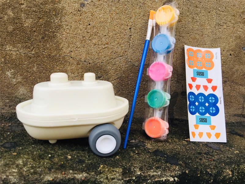 - Hướng dẫn sử dụng: bé dùng cọ tô màu và dán sticker trang trí tàu thủy theo ý thích. Tàu thủy có bánh xe, bé dùng tay đẩy cho tàu chạy