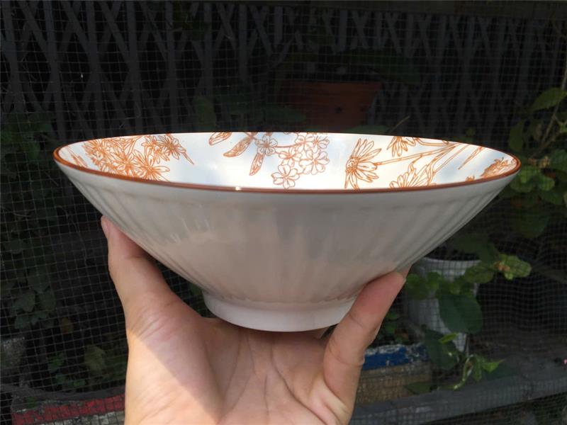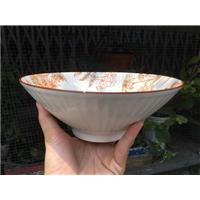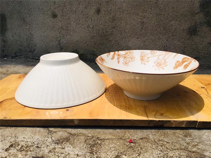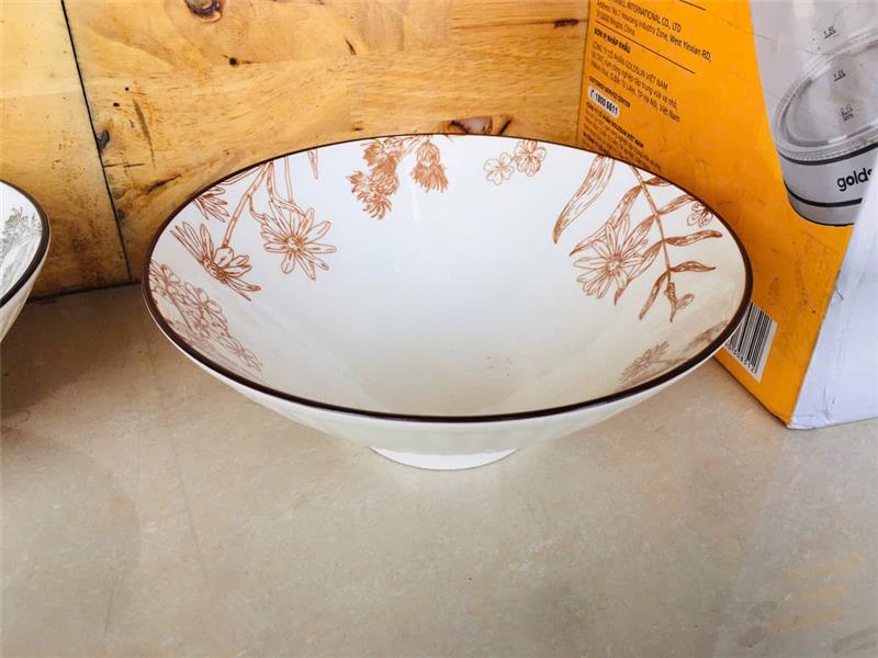 - Màu sắc/ kiểu dáng: tô loe hình nón, miệng viền nâu, lòng tô có họa tiết phong cách Nhật, bên ngoài men trắng.