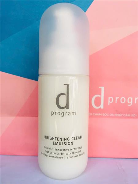 Sữa Dưỡng D Program Whitening Clear Emulsion Trắng Da giúp làm mờ các vết thâm nám, tàn nhang. Kết cấu dạng sữa dịu nhẹ giúp da được cấp ẩm cả ngày. Sữa dưỡng với kết cấu mỏng nhẹ dưỡng sáng, cải thiện kết cấu bên trong và phục hồi bề mặt da. Phiên bản mới bổ sung Công nghệ Microbiome giúp củng cố đề kháng cho da nhạy cảm X3 lần và kiểm soát sự sản sinh hắc tố Melanin, từ đó ngăn ngừa thâm nám, dưỡng da sáng khỏe, rạng ngời.