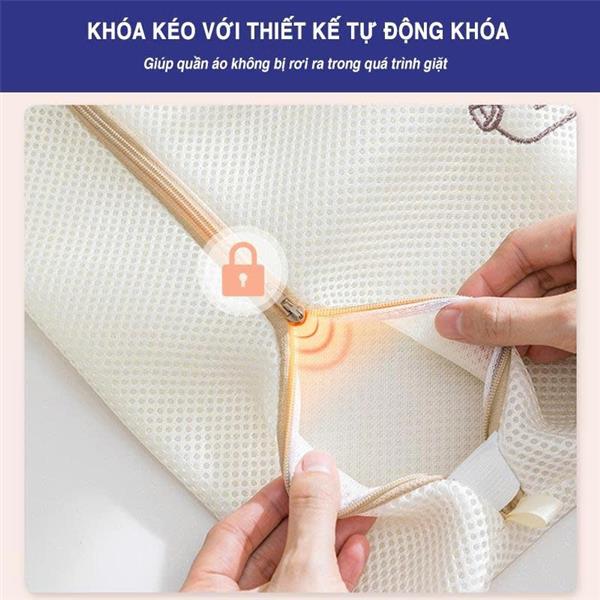 Túi lưới giặt đồ có thiết kế dạng có khóa kéo, với các mắt lưới nhỏ giúp quần áo không bị cuốn vào nhau trong suốt quá trình giặt. Ngoài ra, nó còn giúp bảo vệ giữ gìn quần áo không bị giãn, sợi vải bị đứt, đặc biệt là đối với những quần áo chất liệu mỏng, đồ len,...sẽ được bảo quản và giặt sạch một cách an toàn.