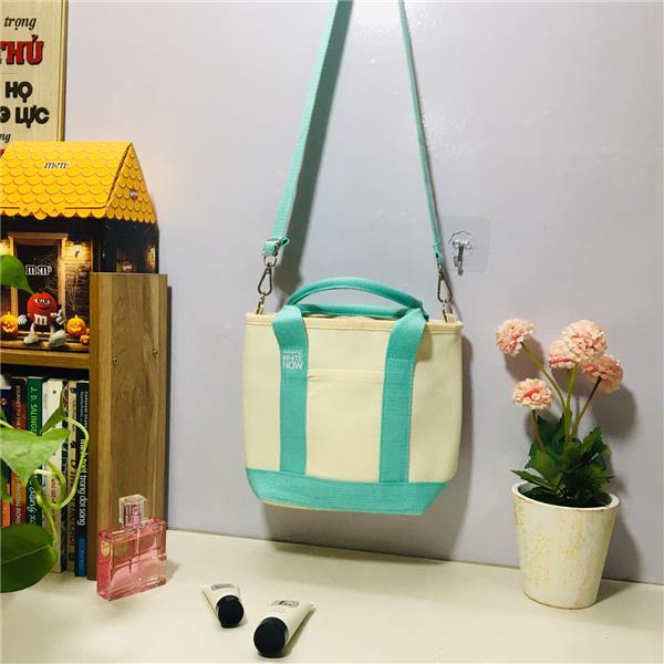 + Túi có 2 quai xách, dây đeo dài có thể tháo rời, miệng túi có nút bấm gài.