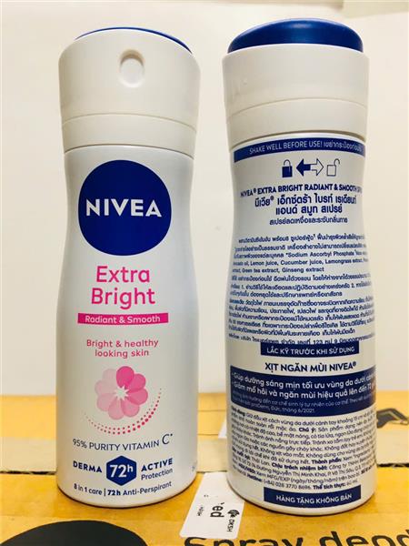 + Xịt Ngăn Mùi Nữ Trắng Mịn Mờ Vết Thâm Nivea là sản phẩm khử mùi dạng chai xịt cho vùng da dưới cánh tay trắng mịn, mờ vết thâm chỉ trong 7 ngày. Đồng thời giảm tiết mồ hôi và ngăn mùi hiệu quả suốt 48 giờ.